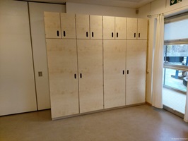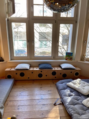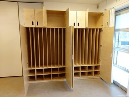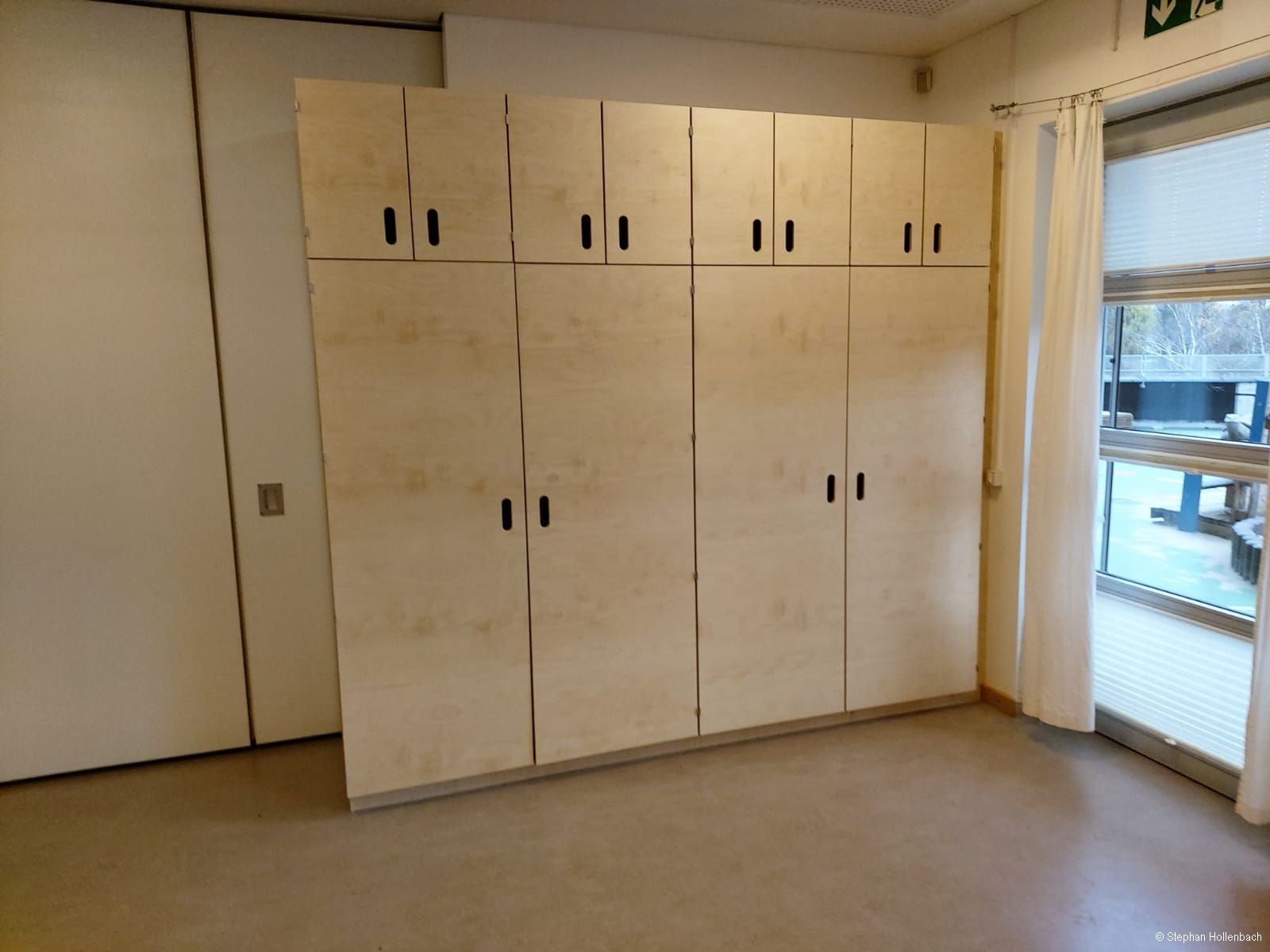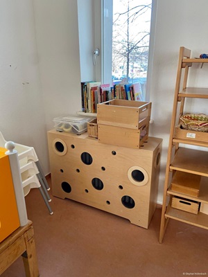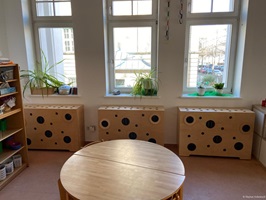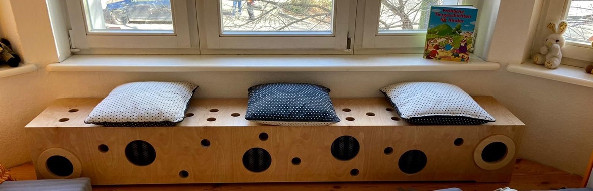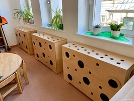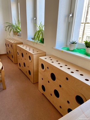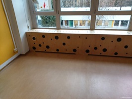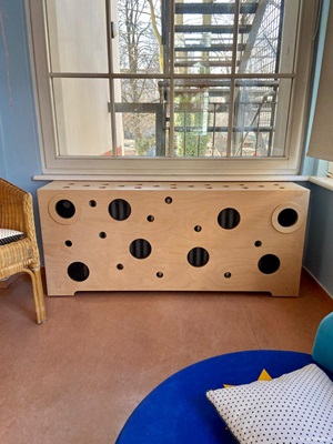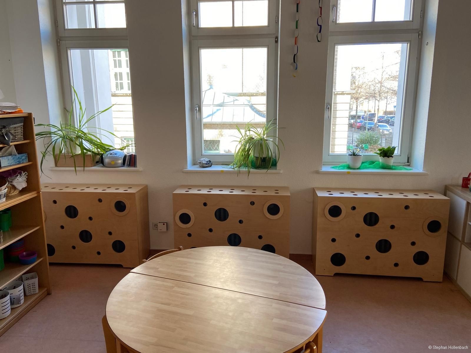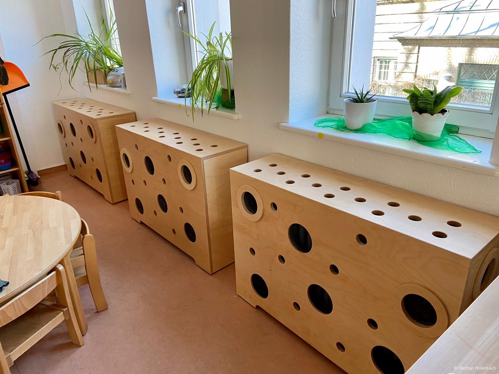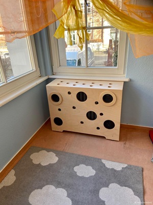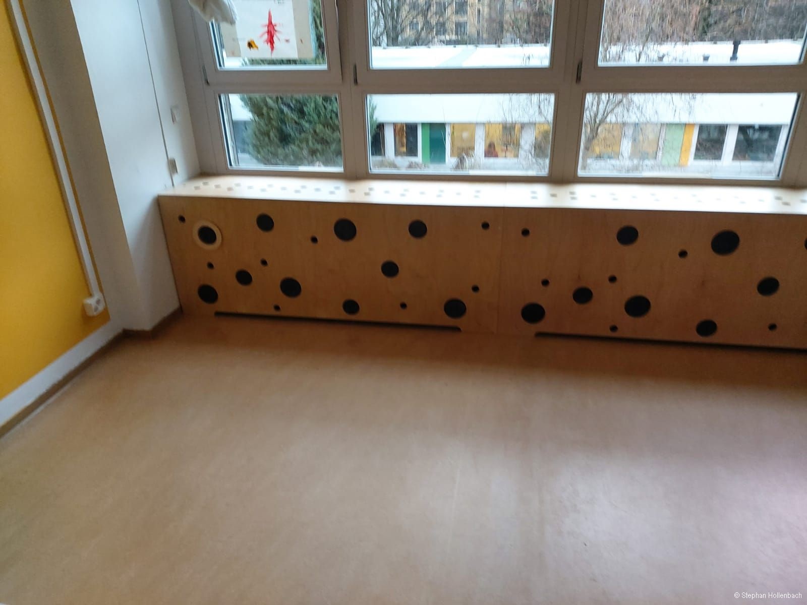 Heizkörperverkleidungen, bestehend aus Birke Multiplex mit Ausschweifungen für Bodenluft und eingefräßten, großen und kleineren Lüftungslöchern für die Zirkulation.