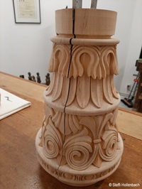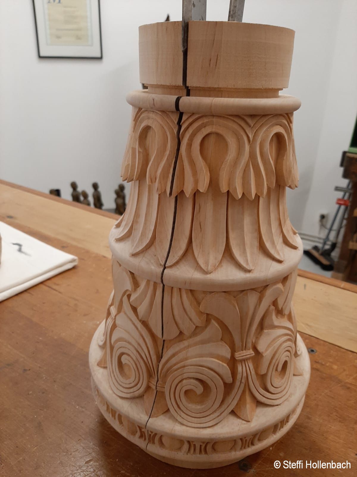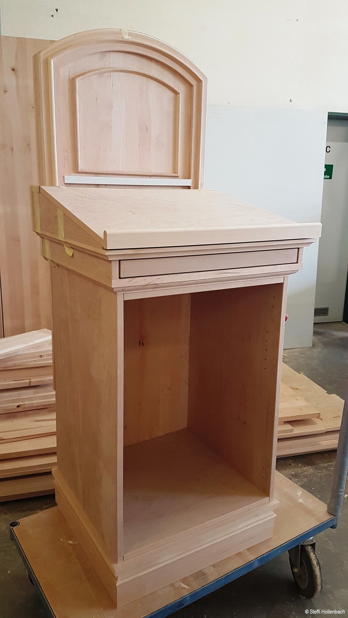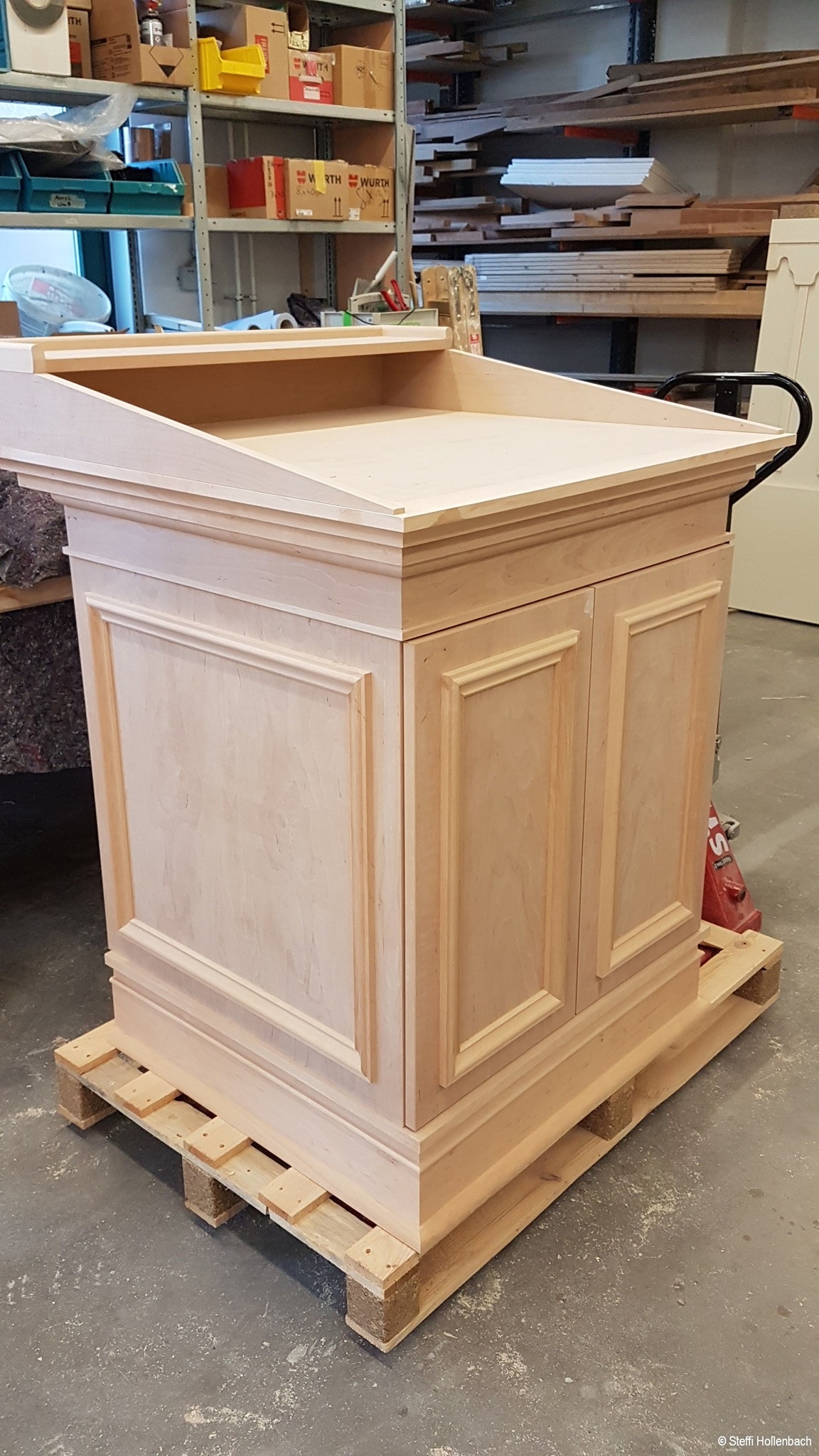 Wir fertigten Säulen mit handgeschnitzten Kapitellen, ein Podest mit gedrechseltem, profiliertem Brüstungsgeländer und eingepasstem Lesepult-Schrank direkt vor dem Thoraschrein-Schrank.