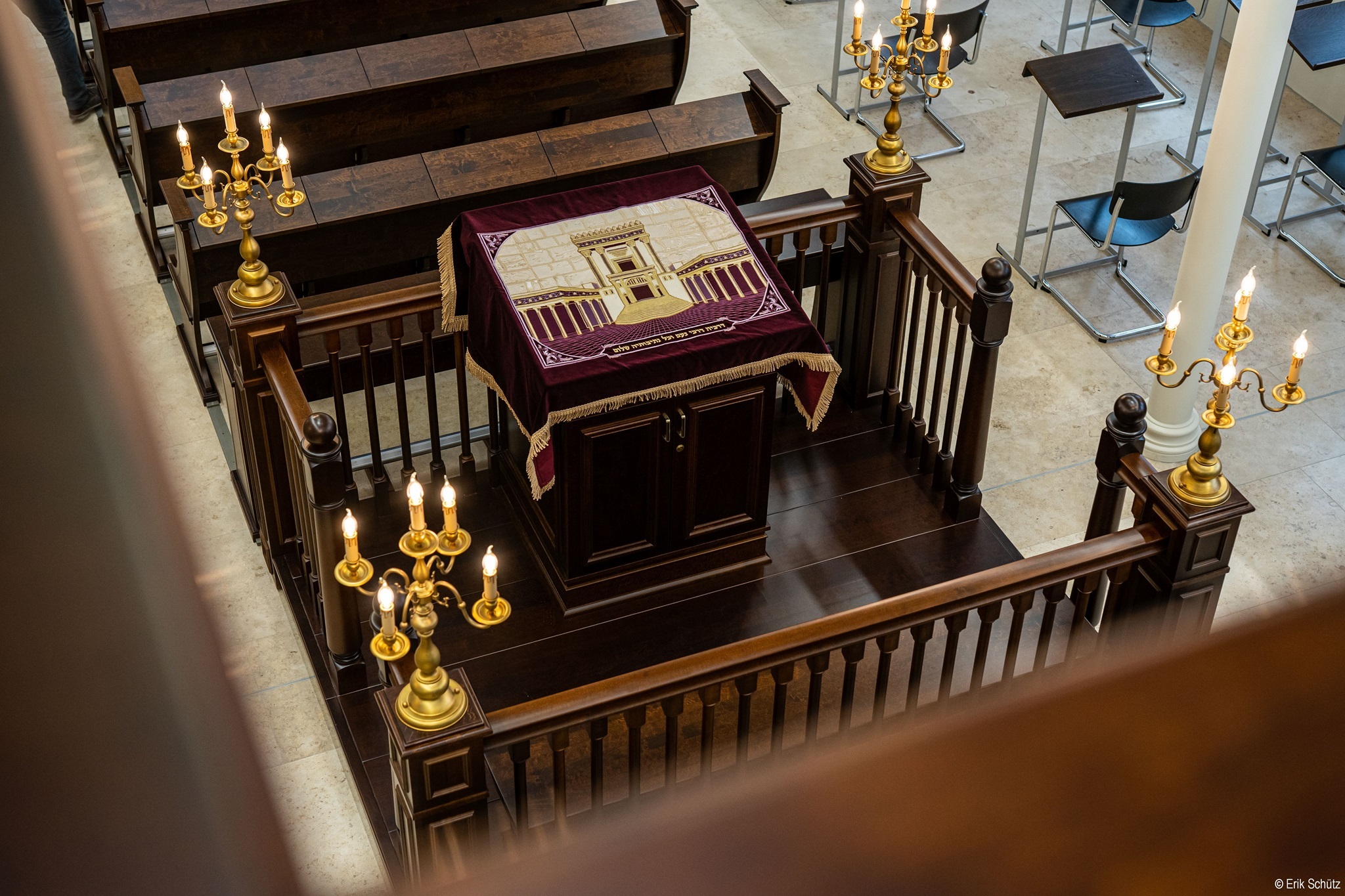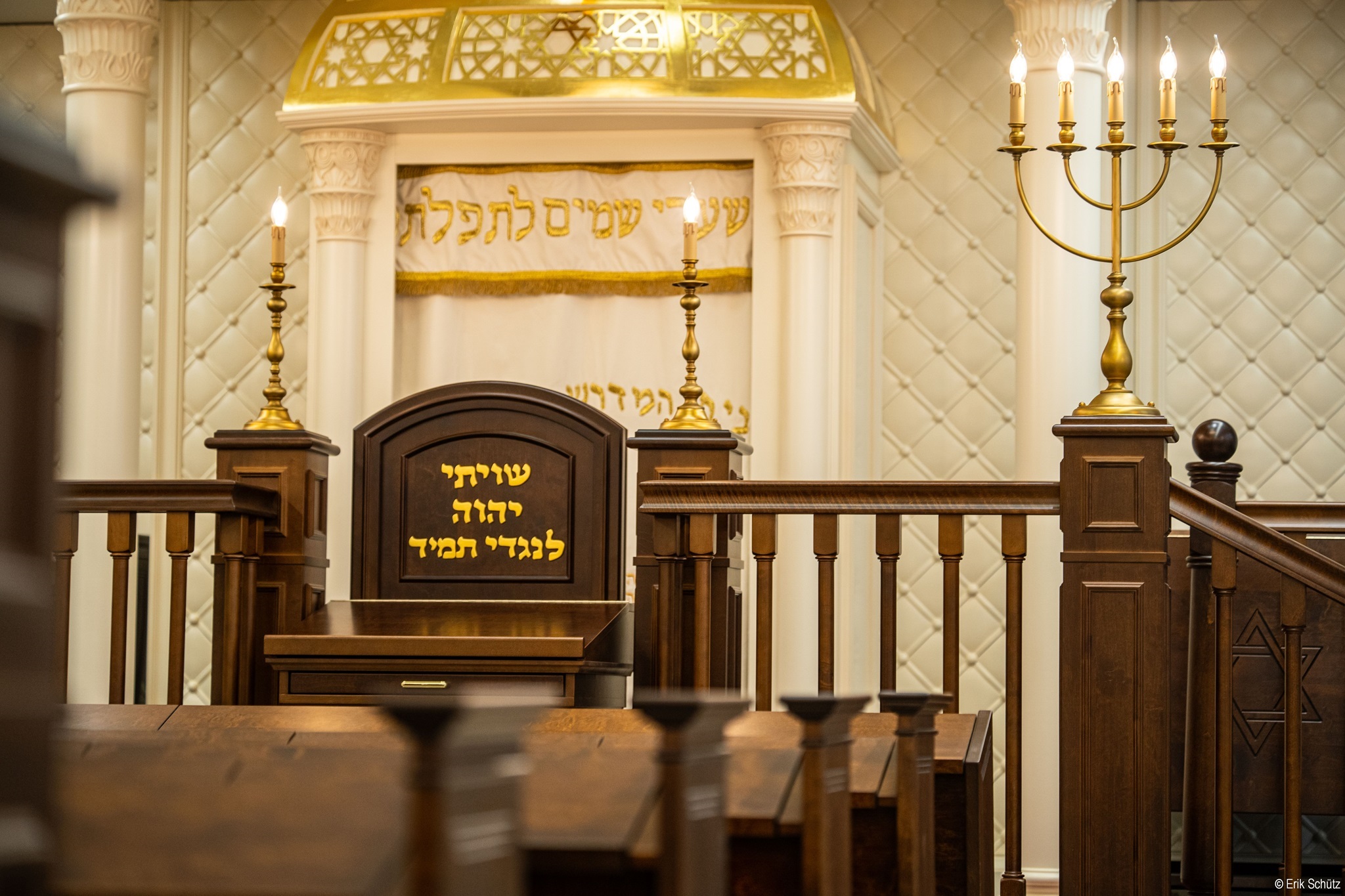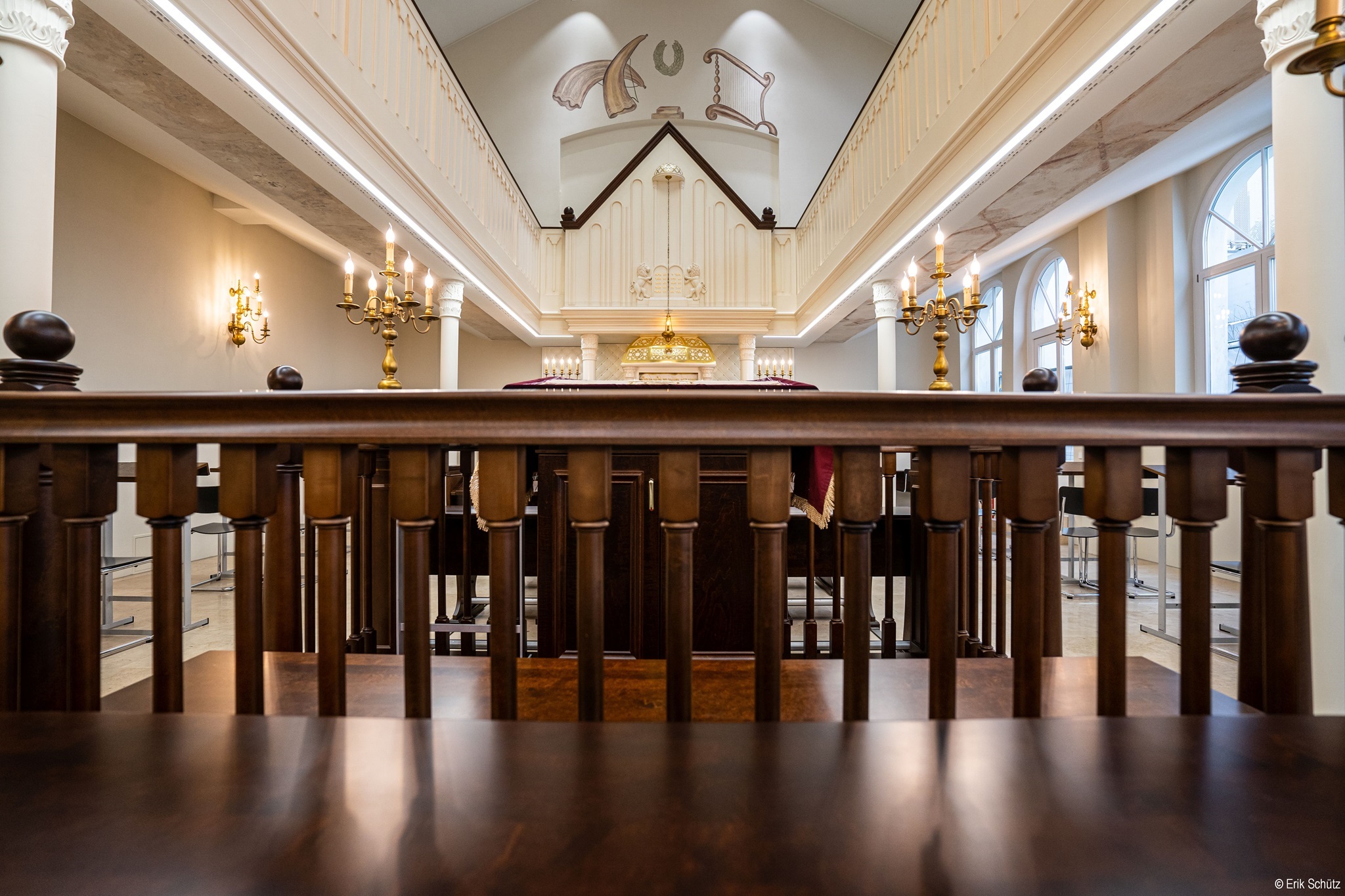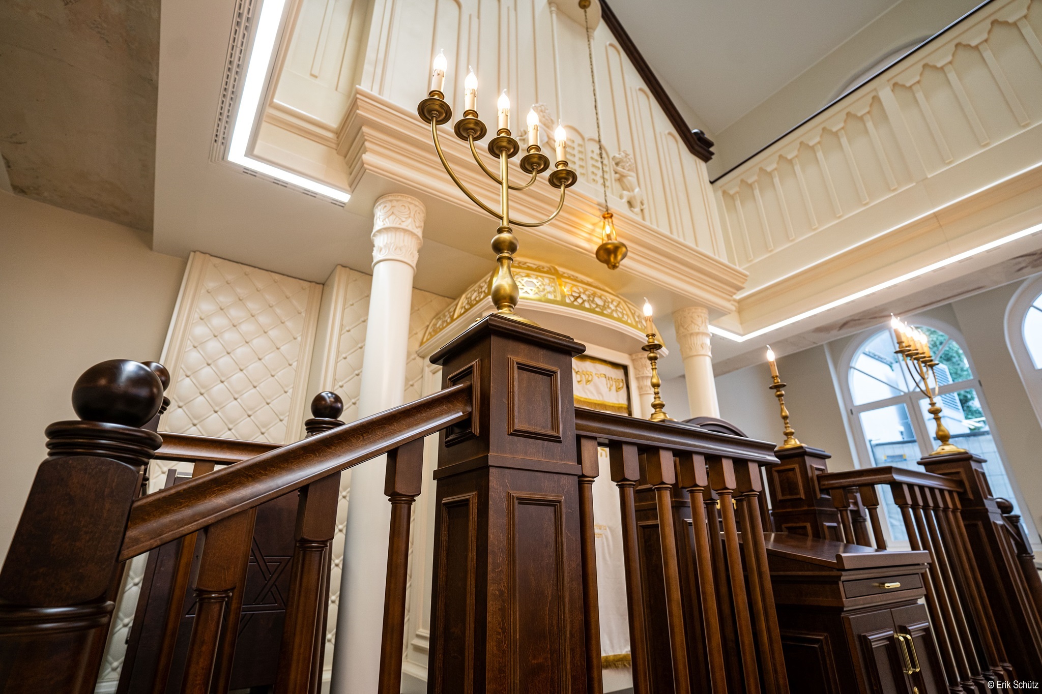 So fertigten und montierten wir eine raumumlaufende Brüstungsverkleidung mit profiliertem Gesims, seitlich profilierten Wandpaneelen rechts und links vor dem Thoraschrein mit kleingewölbten Profilkasetten, zwei goldfarbene, gewölbte Kuppeln mit handgeschnitzter Zierornamentik über dem spitz zulaufendem Überbaudach des Thoraschreins mit handgefertigten Schnitzwerkelementen von Löwen, einer doppelsegmentbogenförmigen Gebetstafel mit hebräischen, vergoldeten Buchstaben.