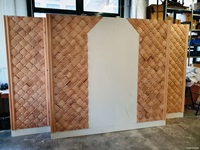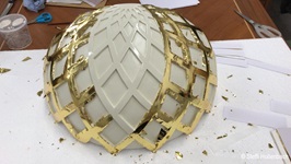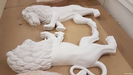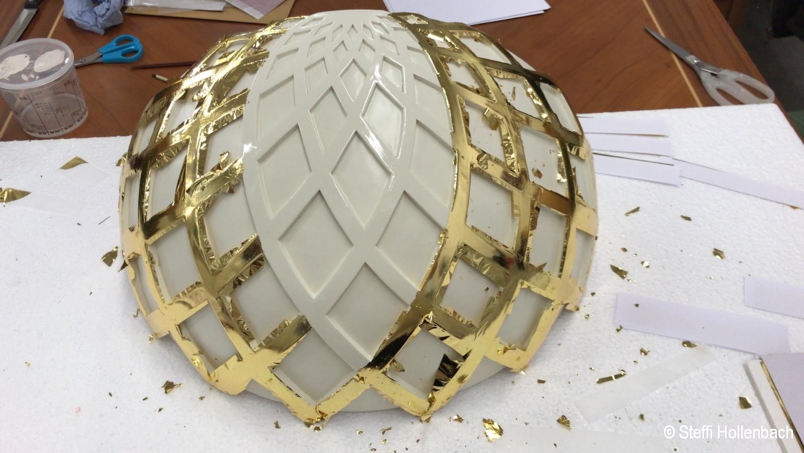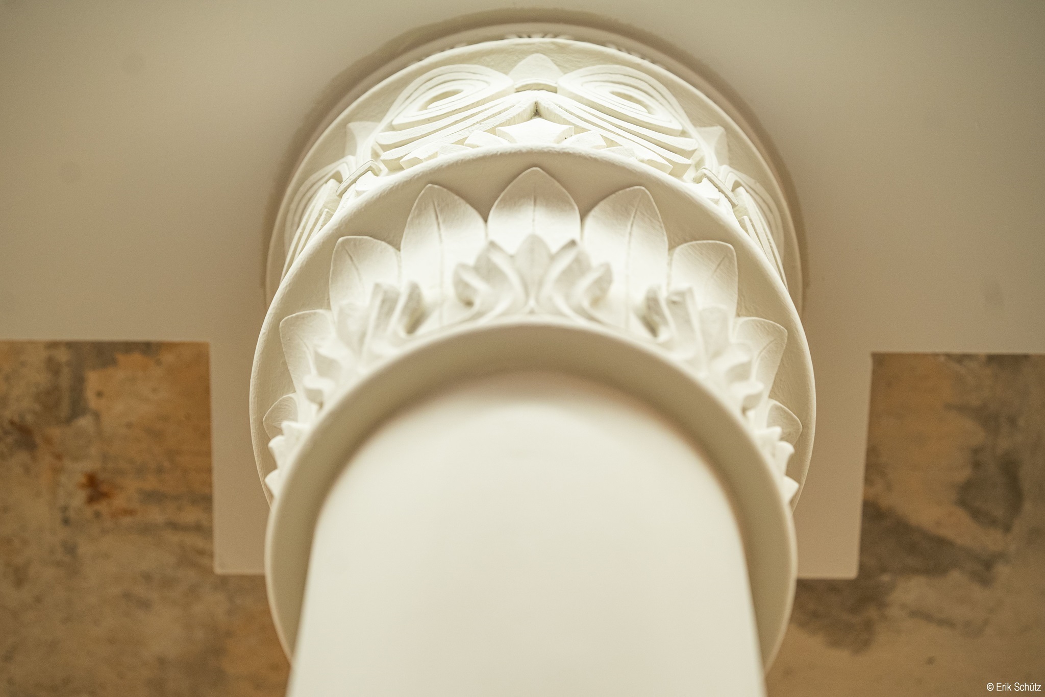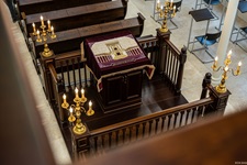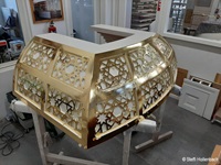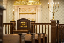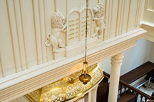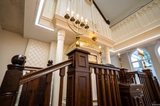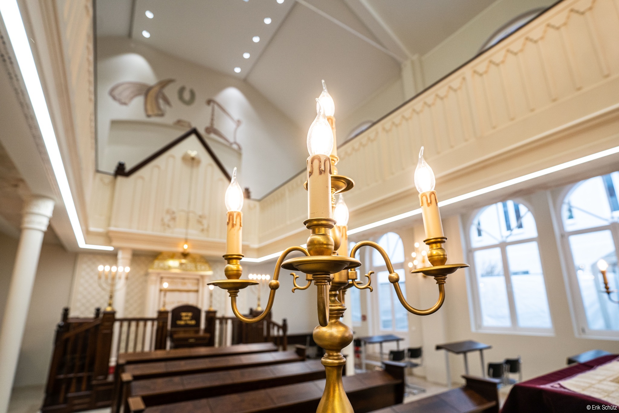 So fertigten und montierten wir eine raumumlaufende Brüstungsverkleidung mit profiliertem Gesims, seitlich profilierten Wandpaneelen rechts und links vor dem Thoraschrein mit kleingewölbten Profilkasetten, zwei goldfarbene, gewölbte Kuppeln mit handgeschnitzter Zierornamentik über dem spitz zulaufendem Überbaudach des Thoraschreins mit handgefertigten Schnitzwerkelementen von Löwen, einer doppelsegmentbogenförmigen Gebetstafel mit hebräischen, vergoldeten Buchstaben.
