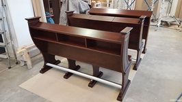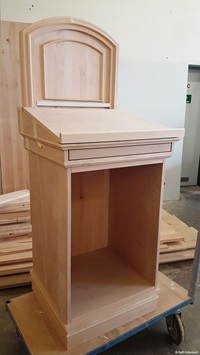 Ein mittig im Gebetssaal stehendes und variabel verschiebbares Podest (Bima) mit Lesepult-Schrank wurde hergestellt und montiert. Ebenso zwei raumhohe, offene, nischeneingepasste Bücherregale.